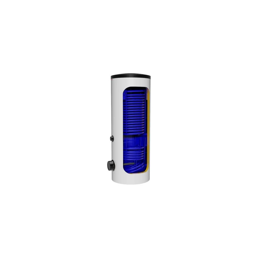 - s dvoma výmenníkmi, horný veľký výmenník na pripojenie zdroja ohrevu (tepelné čerpadlo, nízkoteplotný zdroj) a spodný výmenník (napr. solár)