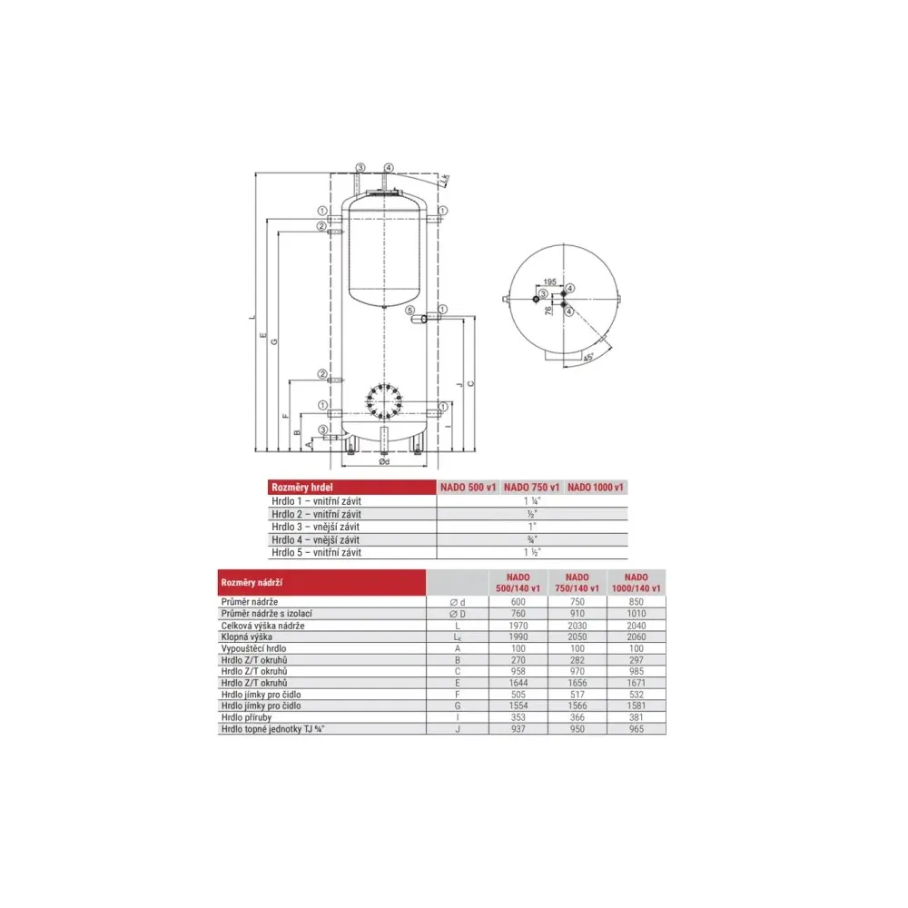Akumulačné nádrže NADS v3 sa vyrábajú bez príruby, iba s nátrubkami. Do hrdiel je možné inštalovať elektrickú výhrevnú jednotku TJ 6/4".